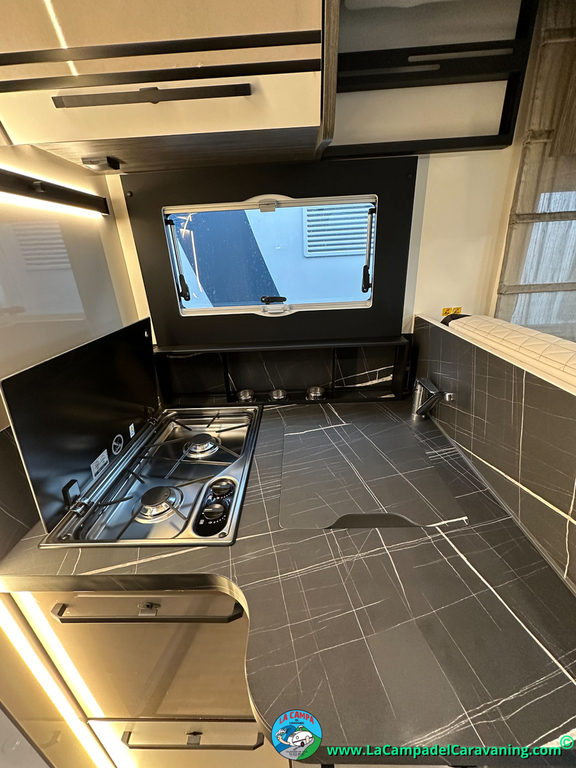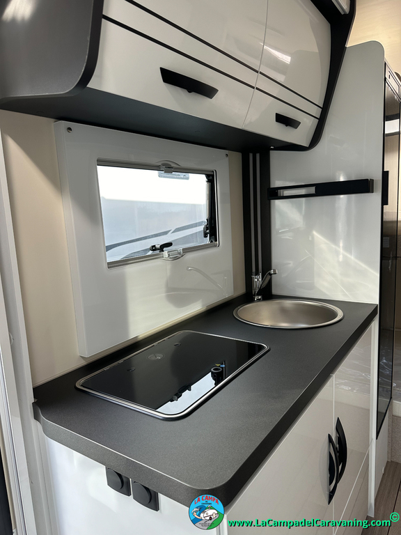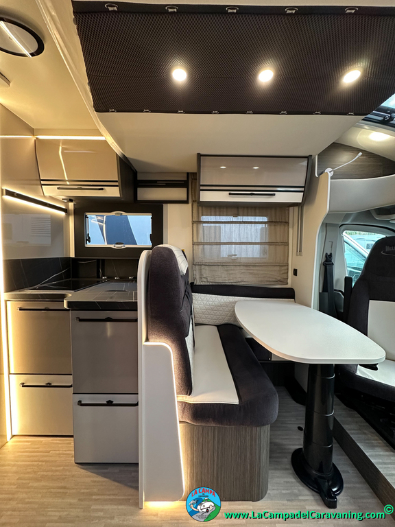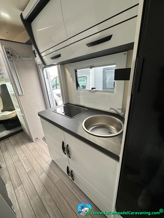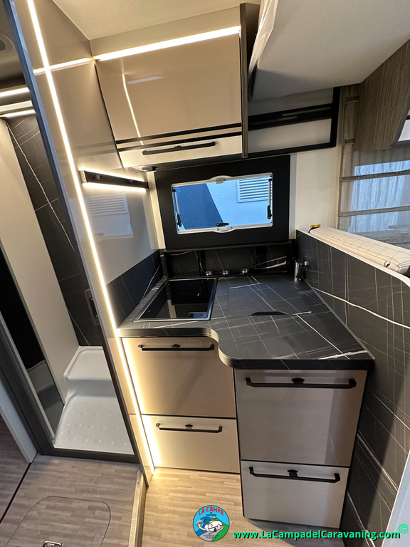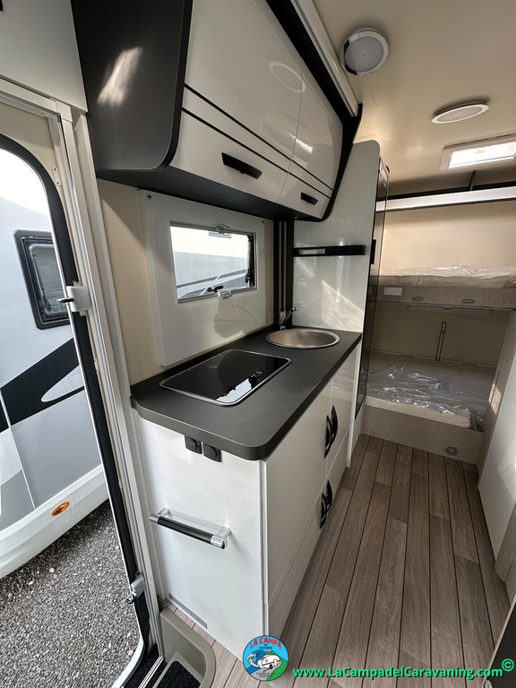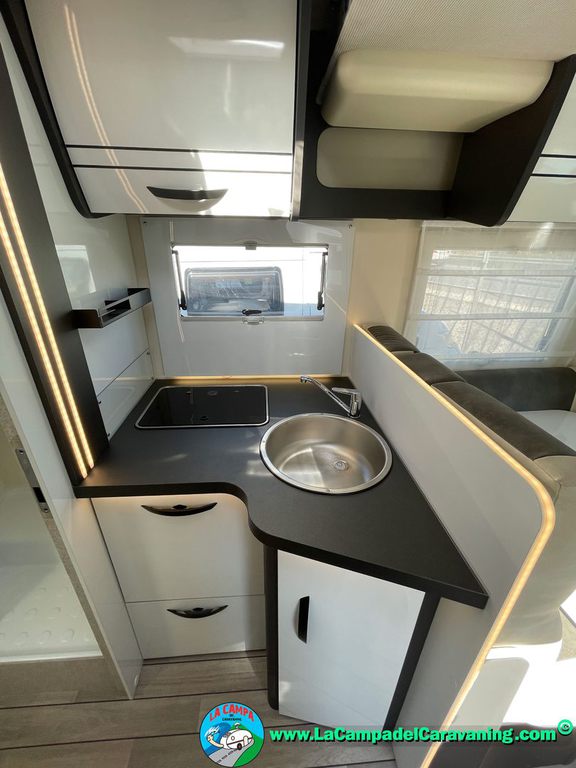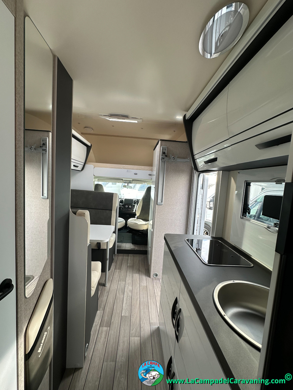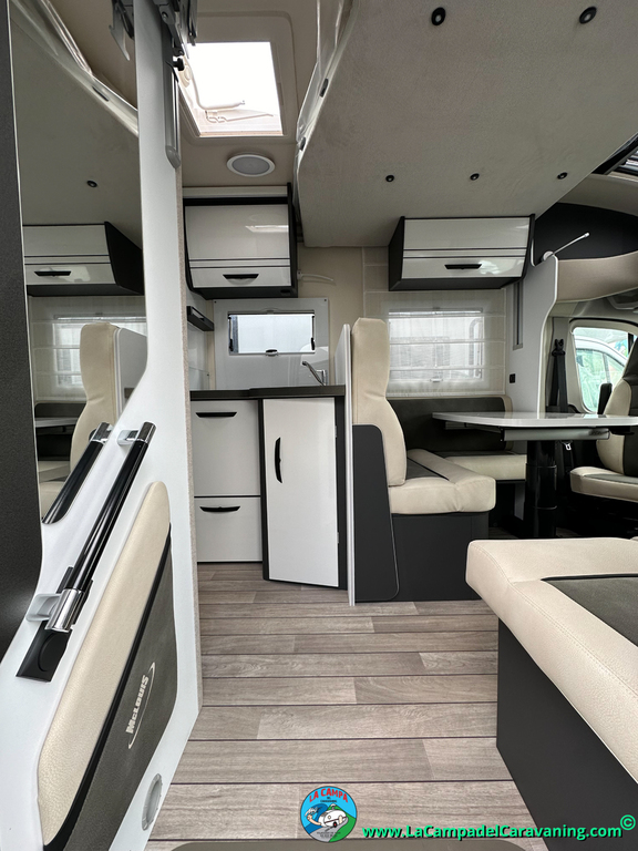 Nevera 150l. Wc y Ducha independiente con puerta de doble cierre convertible en suite, cocina en L. luces de ambiente, led, boiler Truma gas, puerta vivienda con cierre centralizado, 3 claraboyas (1 Panoramica)