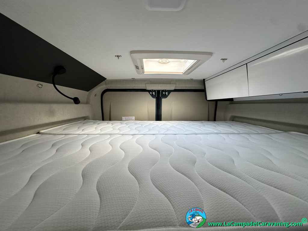 1 Cama doble en la parte trasera, cama superior extraible y cama infeior con somier elevable