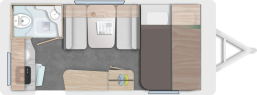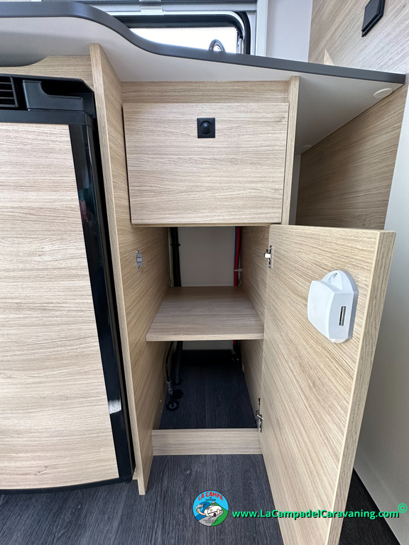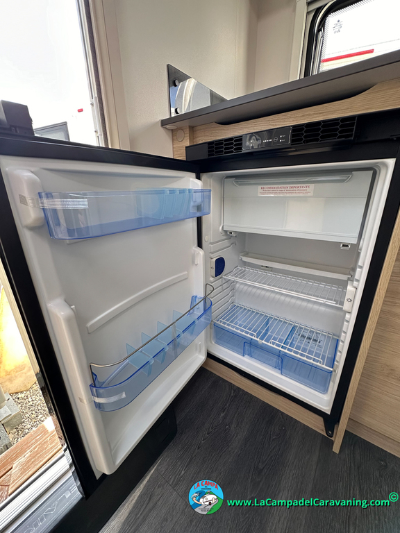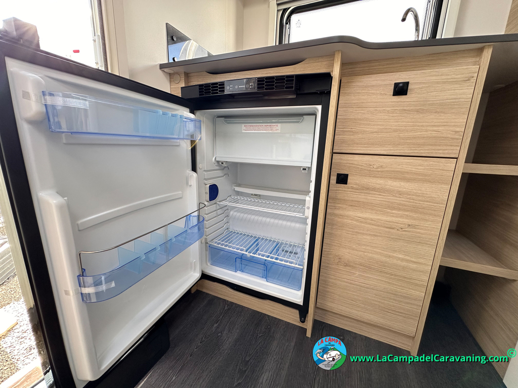 Nevera 85L a compresor, agua caliente, 2 claraboyas, WC químico, plato de ducha, luces led, luz ambiente.