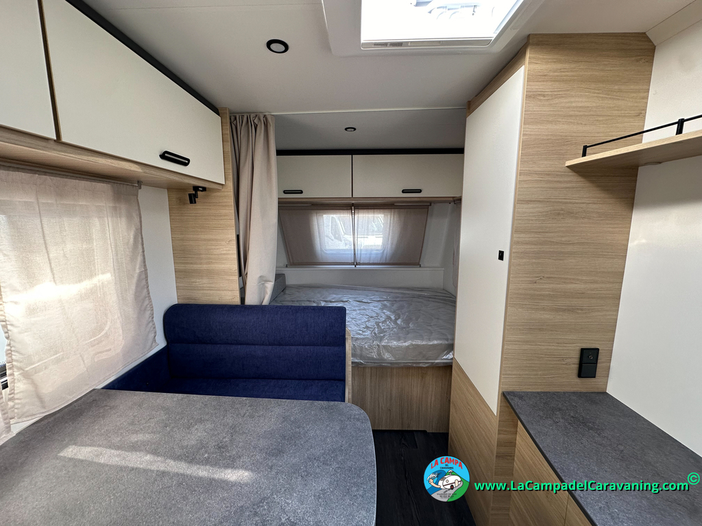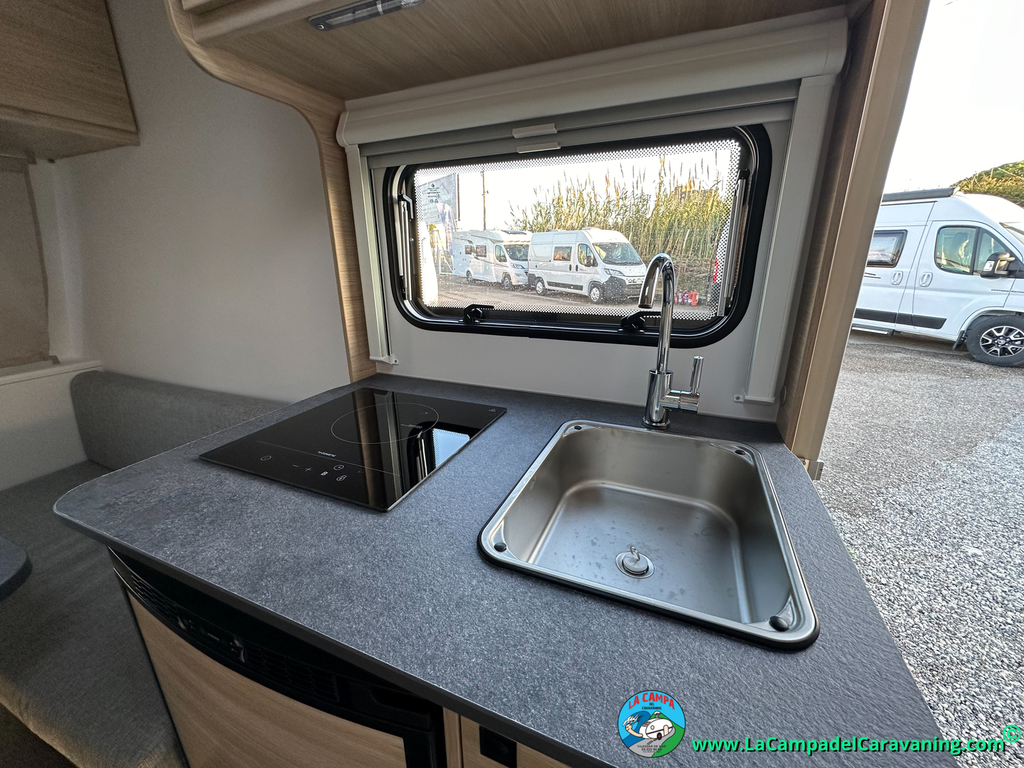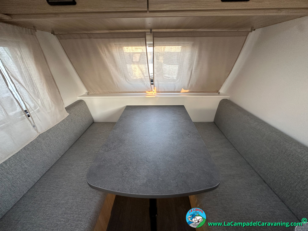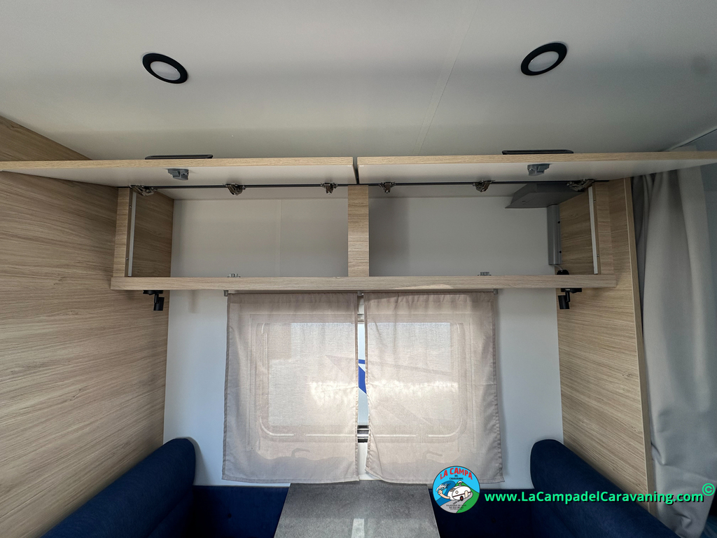 Nevera 150L a compresor con congelador, Truma combi 4 agua caliente y calefaccion con aire impulsado por conductos, Mosquitera en puerta entrada XL, Llantas aluminio negras, WC químico, Plato de ducha con mampara, Luces de leeds, Luz ambiente, Soporte rueda de recambio, Deposito agua limpia 50l y Depositos de aguas grises, Estabilizador Alko.