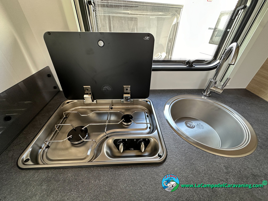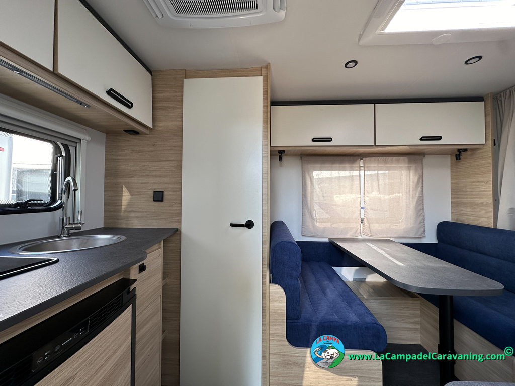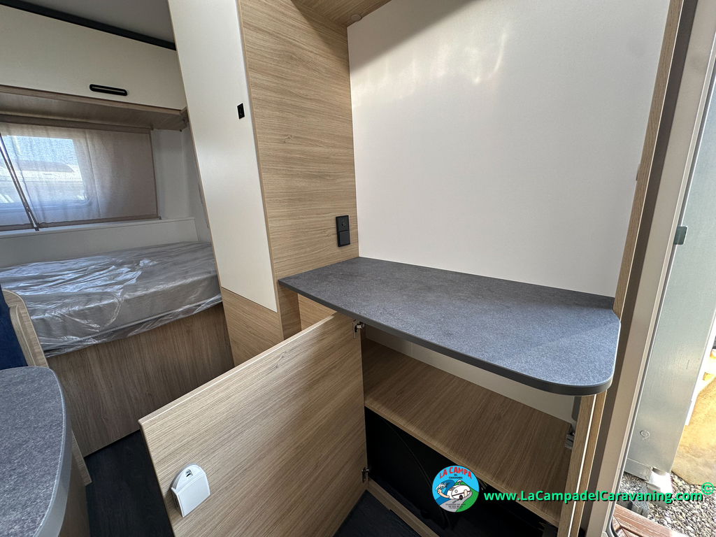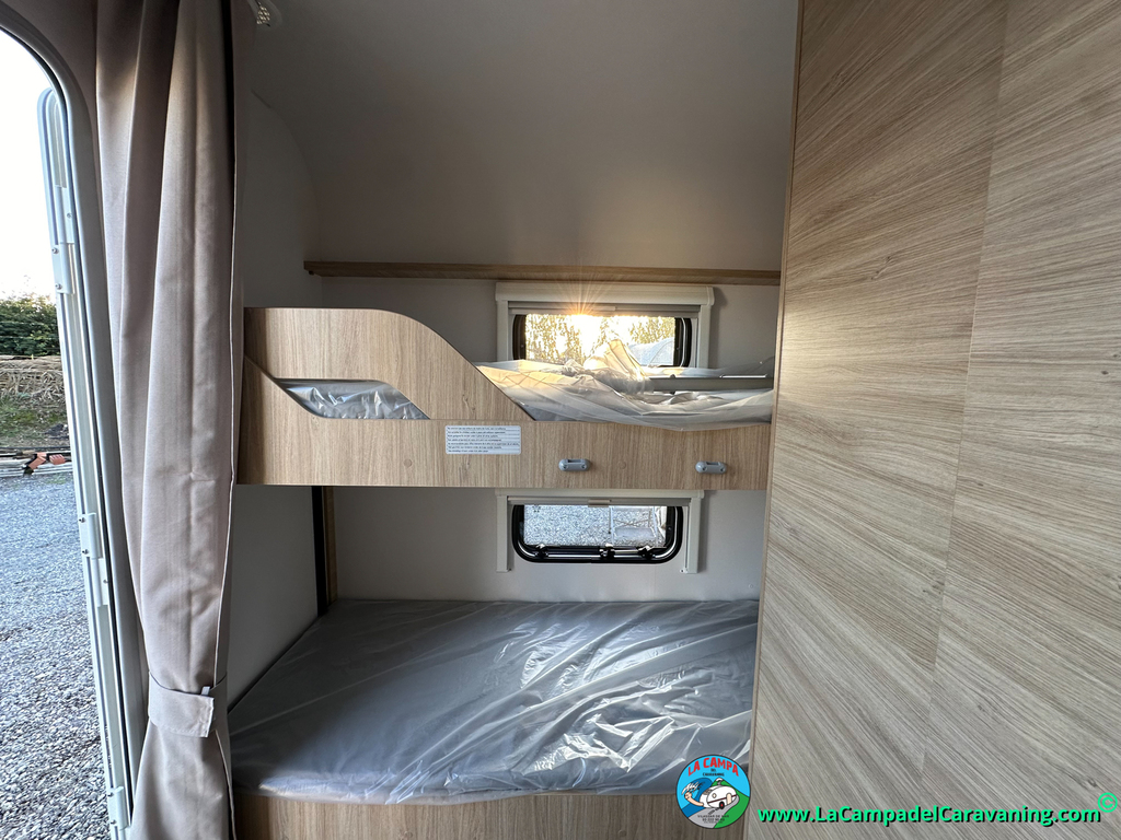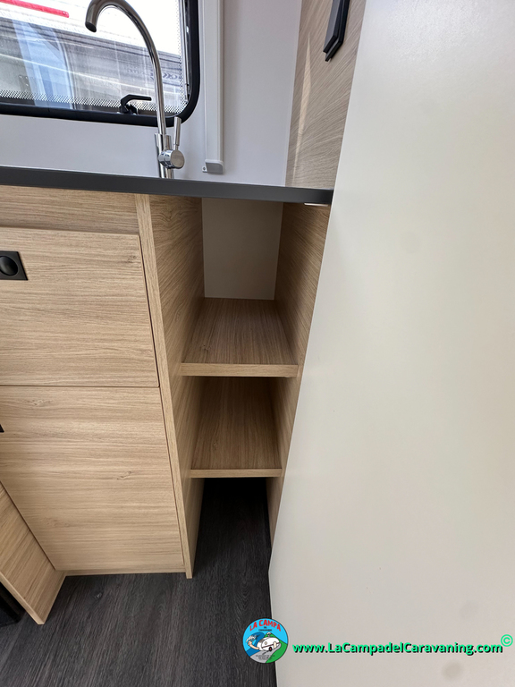 Nevera 150L a compresor con congelador, Truma combi 4 agua caliente y calefaccion con aire impulsado por conductos, Mosquitera en puerta entrada XL, Llantas aluminio negras, WC químico, Plato de ducha con mampara, Luces de leeds, Luz ambiente, Soporte rueda de recambio, Deposito agua limpia 50l y Depositos de aguas grises, Estabilizador Alko.