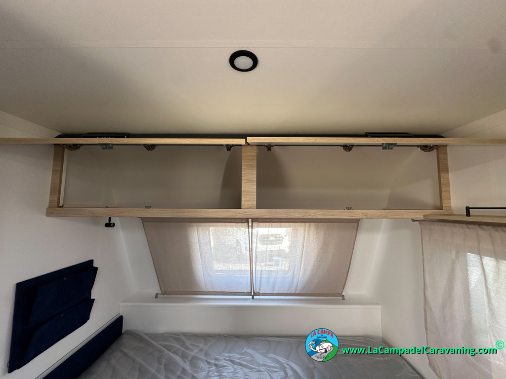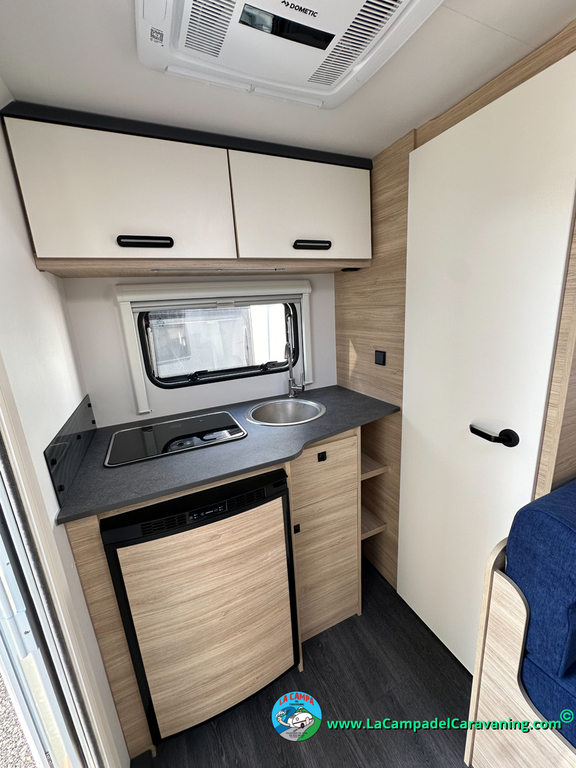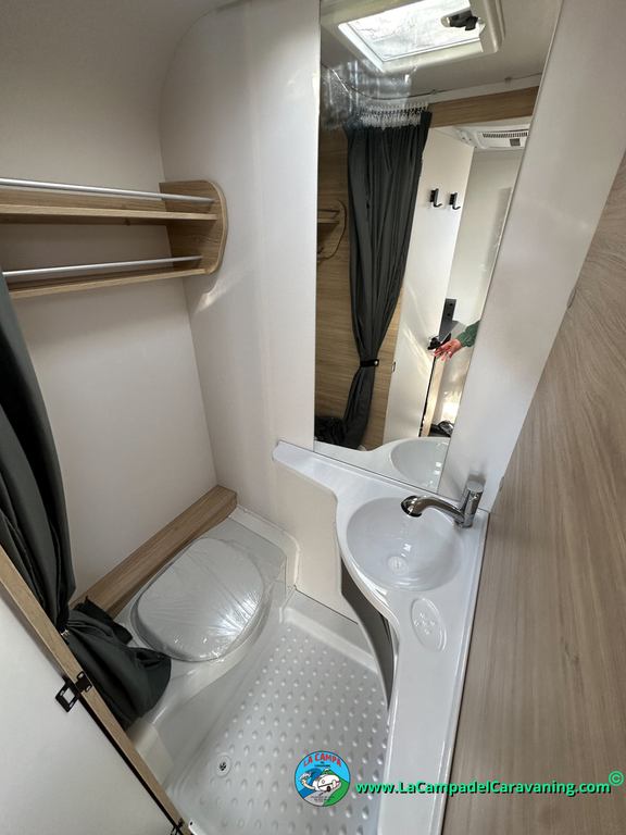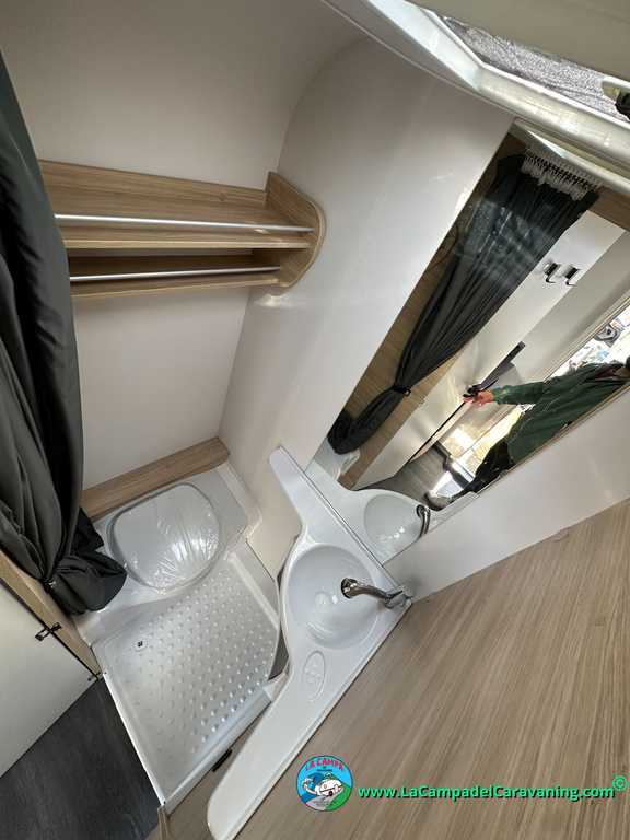 Nevera 150L a compresor con congelador, agua caliente, 2 claraboyas (1 panorámica), WC químico, plato de ducha + flexo con cortina, luces led, luz ambiente.