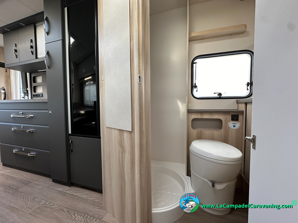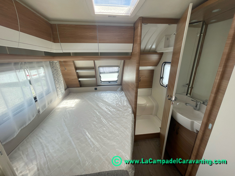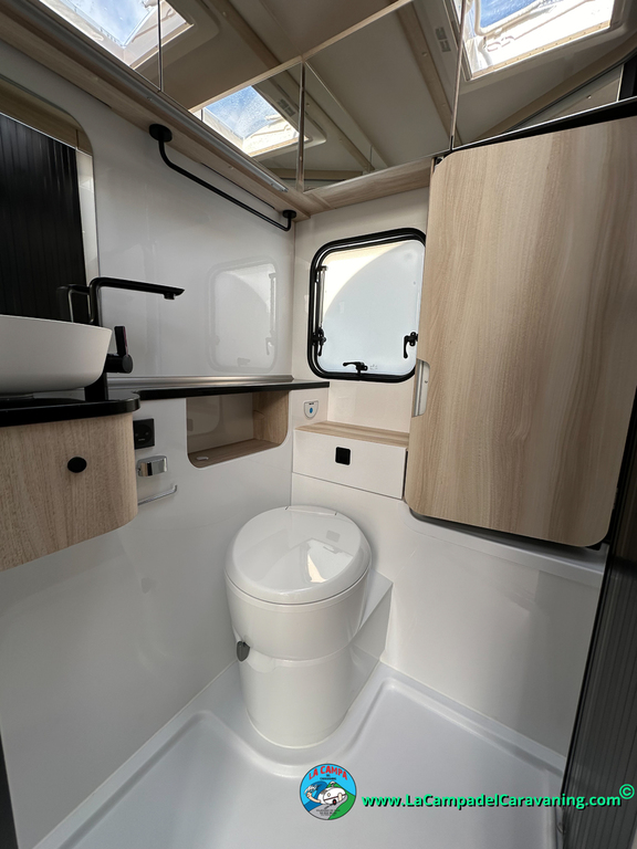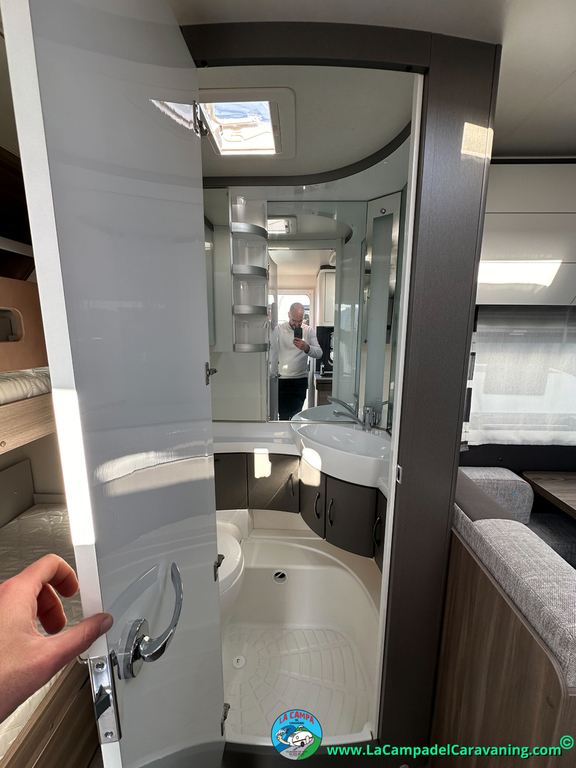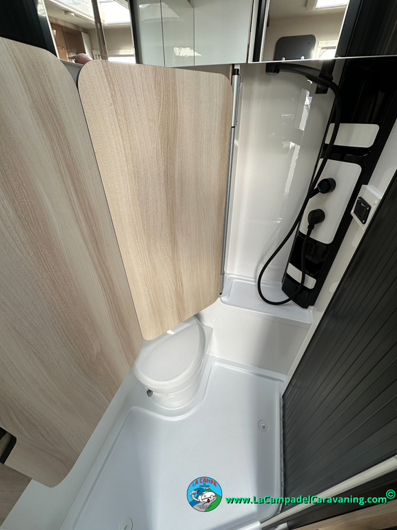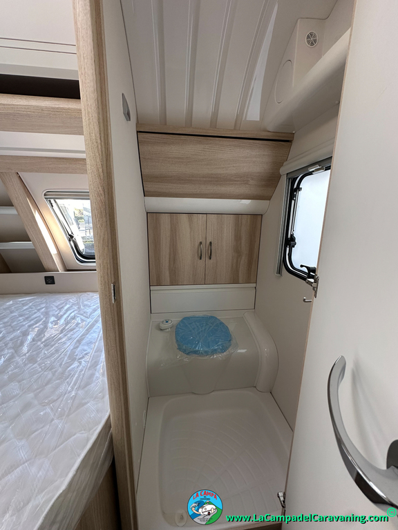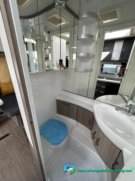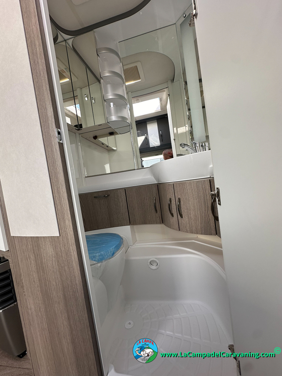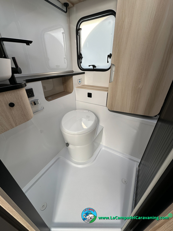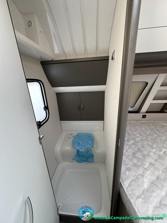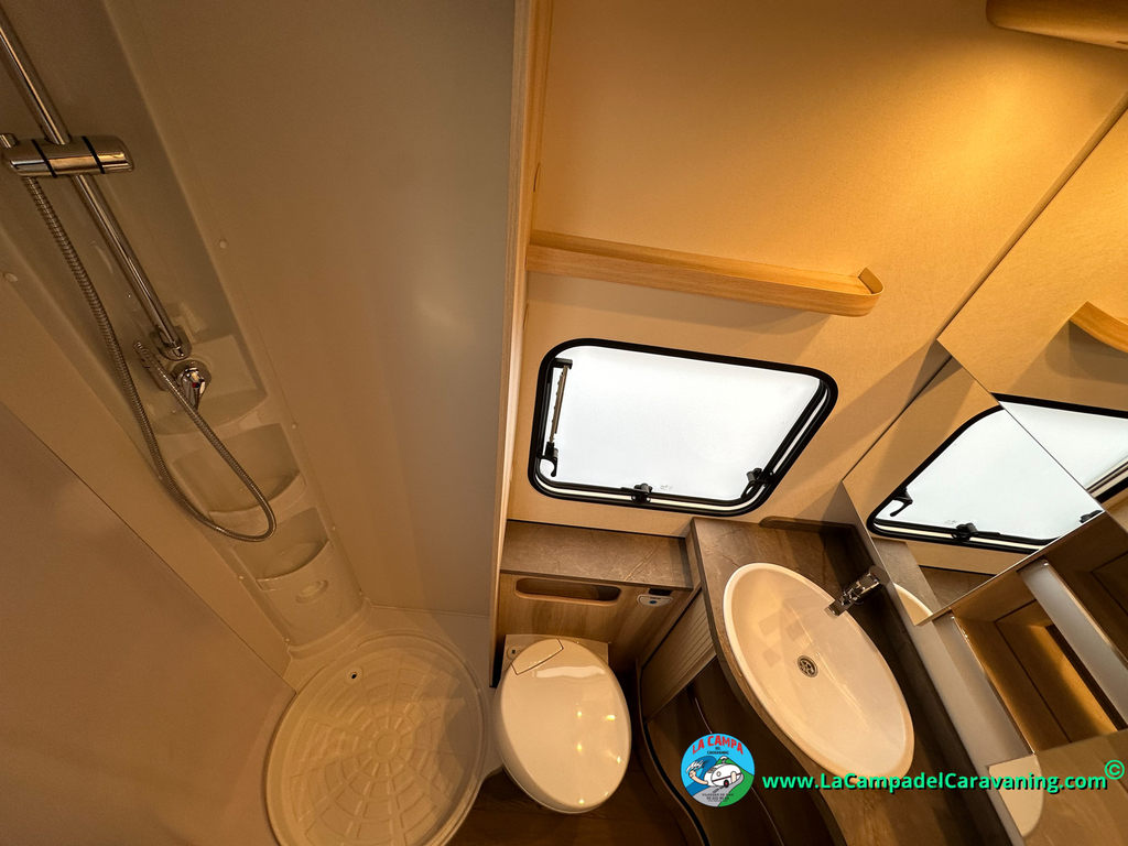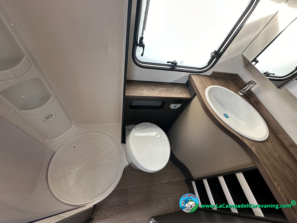 A destacar su baño con ducha independiente enorme. Un baño que enamora. Si buscas caravana y poder ducharte en ella con tu familia es de lo mas polivalente. Apta para parejas y familias con niños
