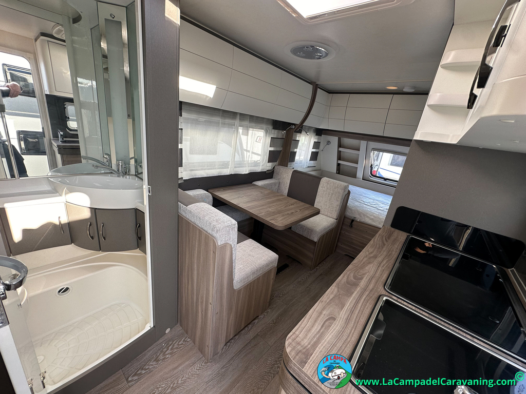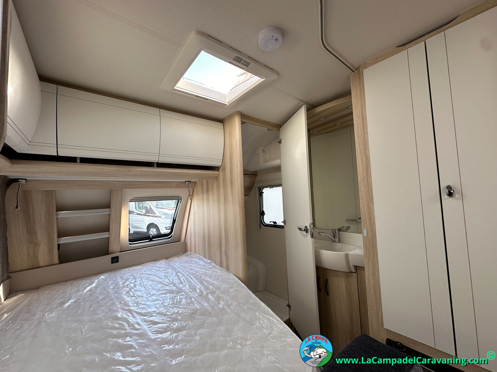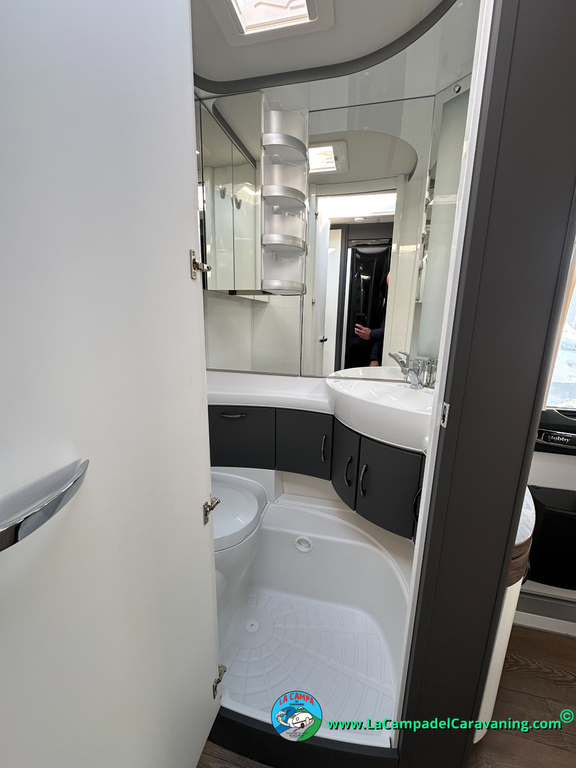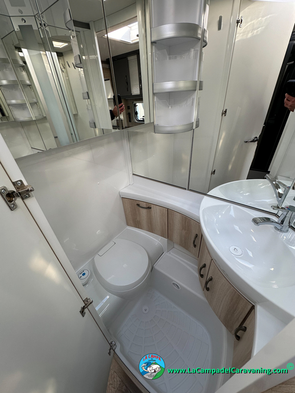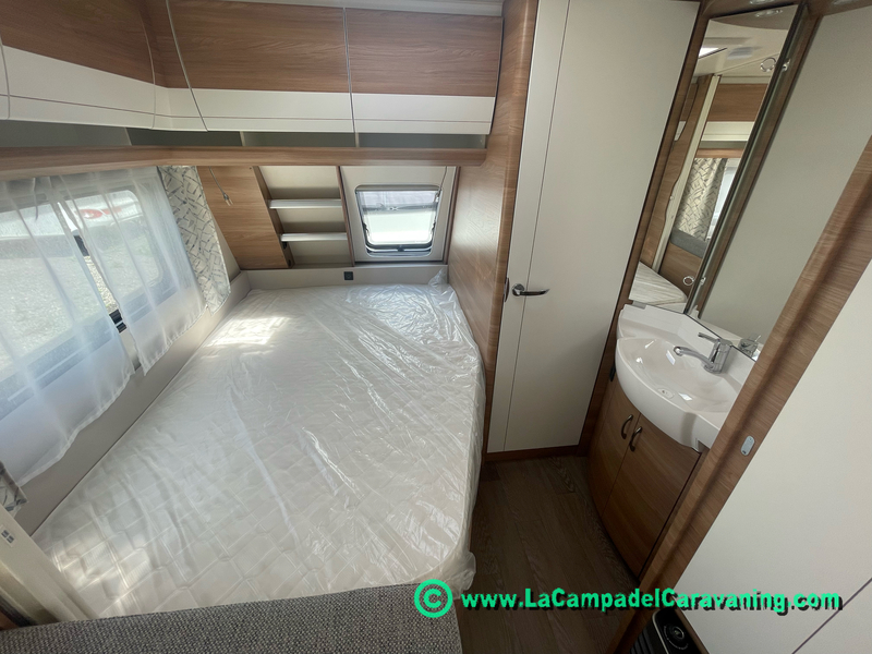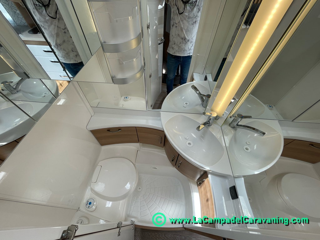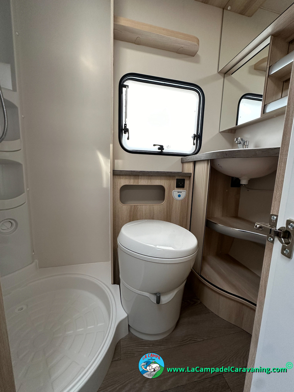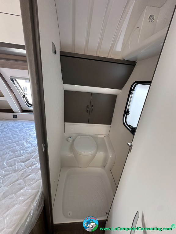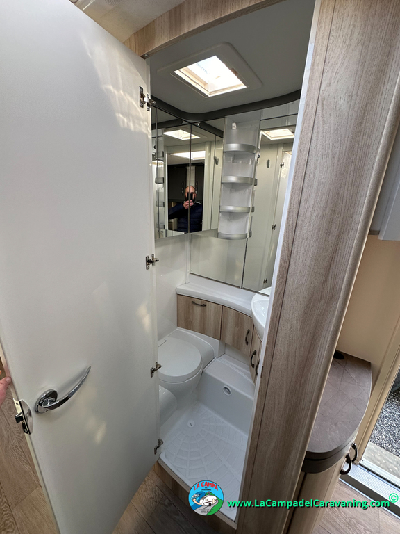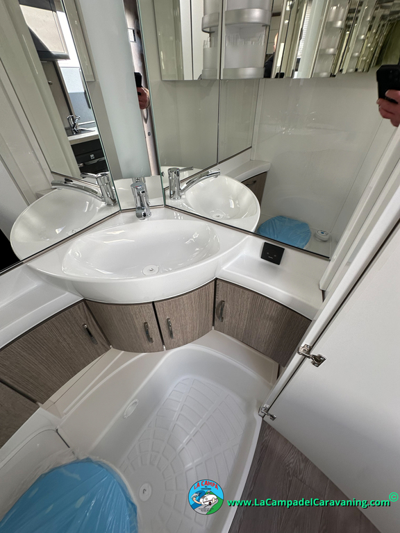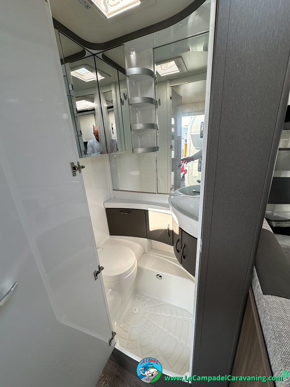 A destacar su baño con ducha independiente enorme. Un baño que enamora. Si buscas caravana y poder ducharte en ella con tu familia es de lo mas polivalente. Apta para parejas y familias con niños