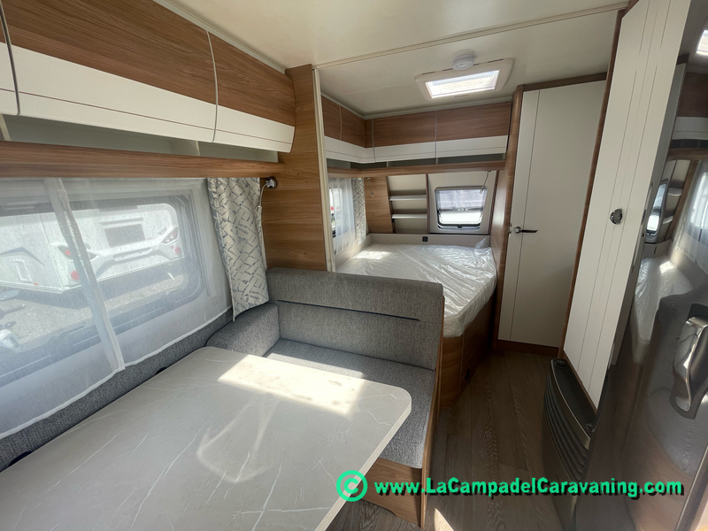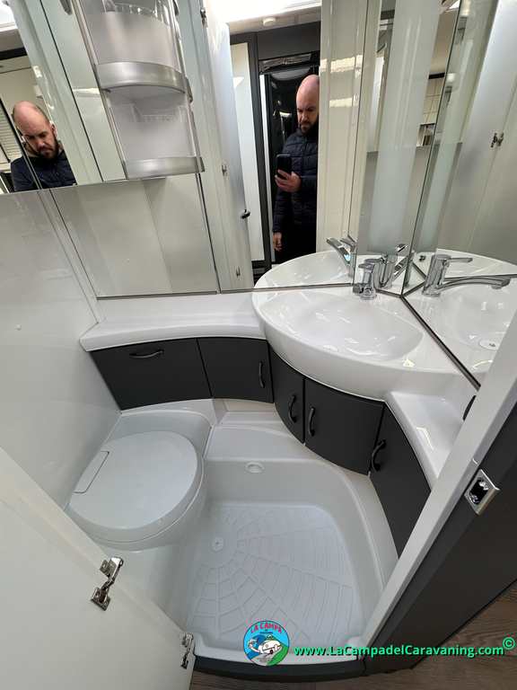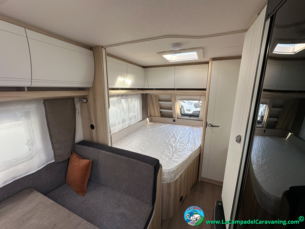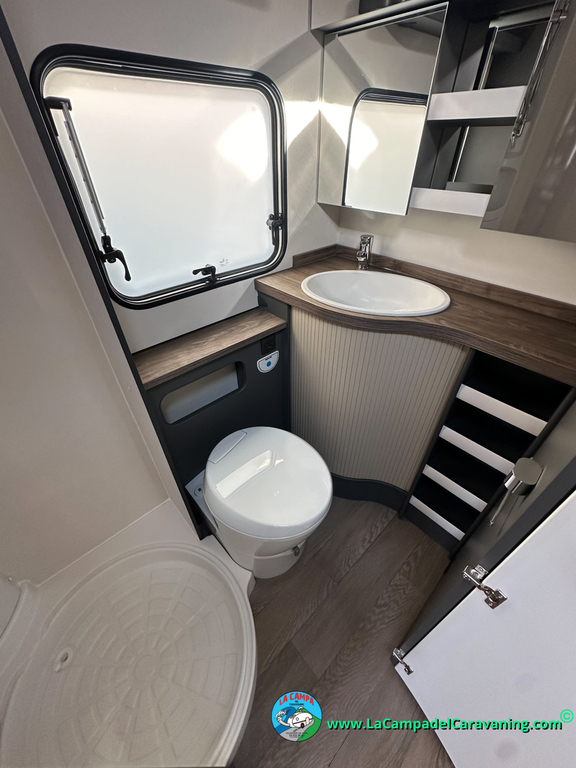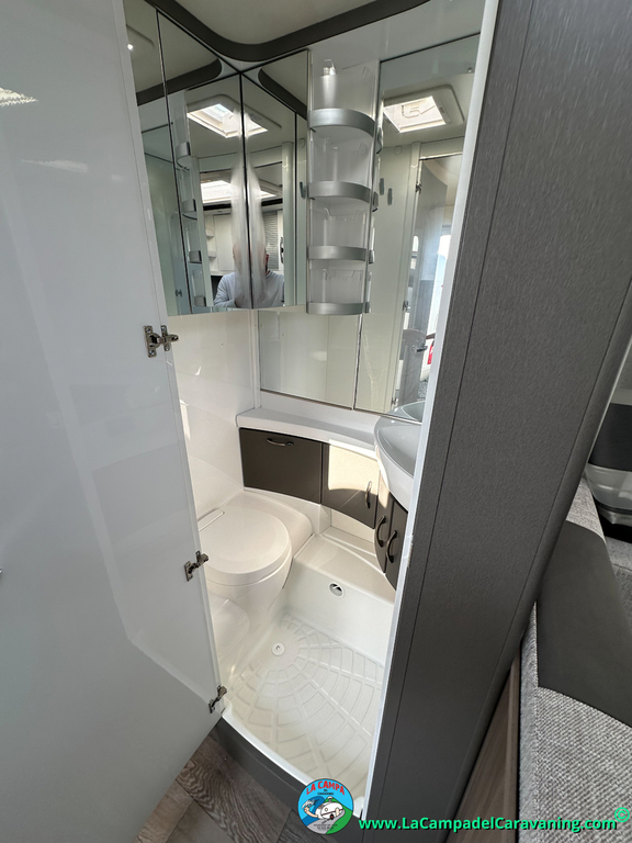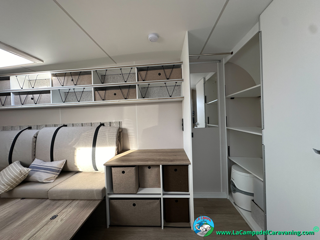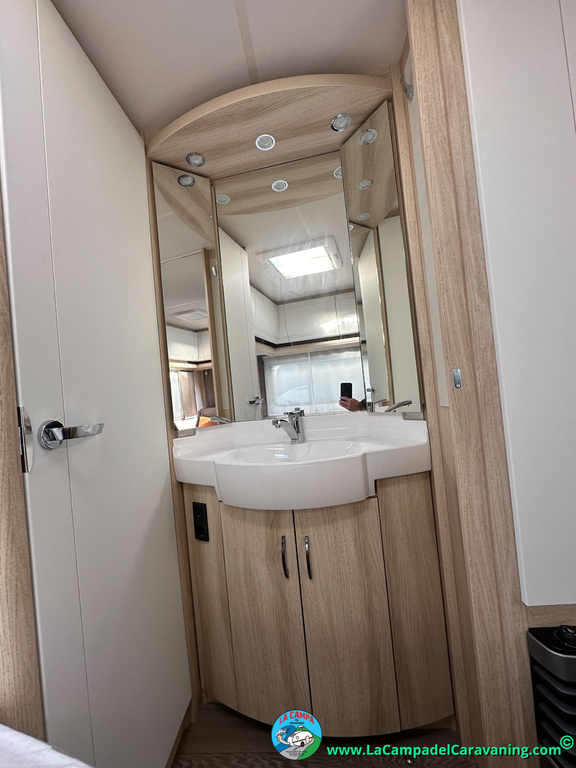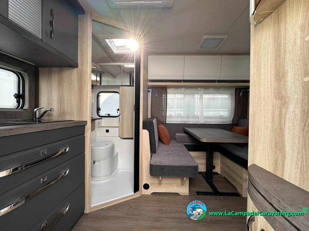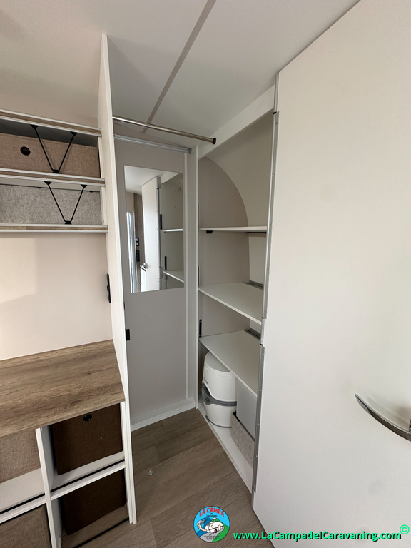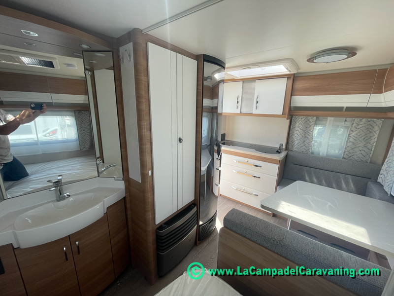 A destacar su baño con ducha independiente enorme. Un baño que enamora. Si buscas caravana y poder ducharte en ella con tu familia es de lo mas polivalente. Apta para parejas y familias con niños