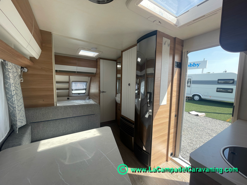 Calefacción por conductos, nevera 150L diseño especial Hobby trivalente con congelador, agua caliente, mosquitera en puerta de entrada, 2 claraboyas (1 panorámica), estabilizador, WC químico, plato de ducha, luces de leeds, luz ambiente regulable desde cuadro luces automático..