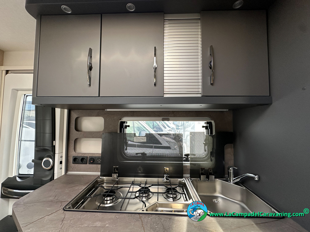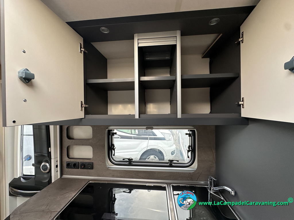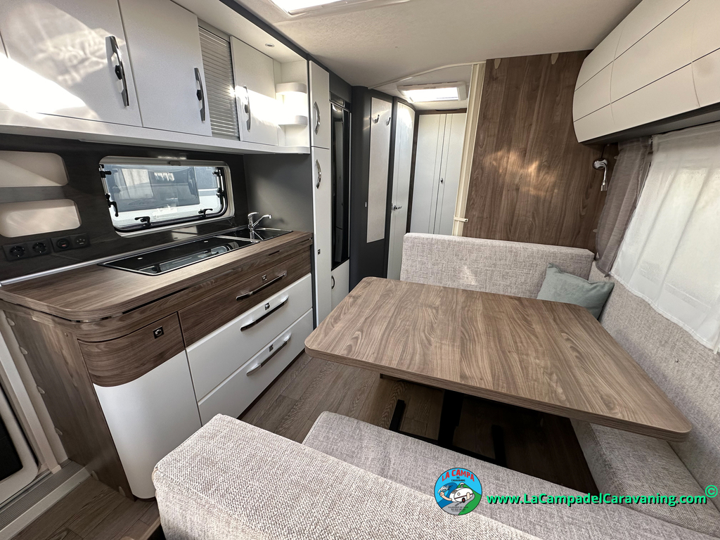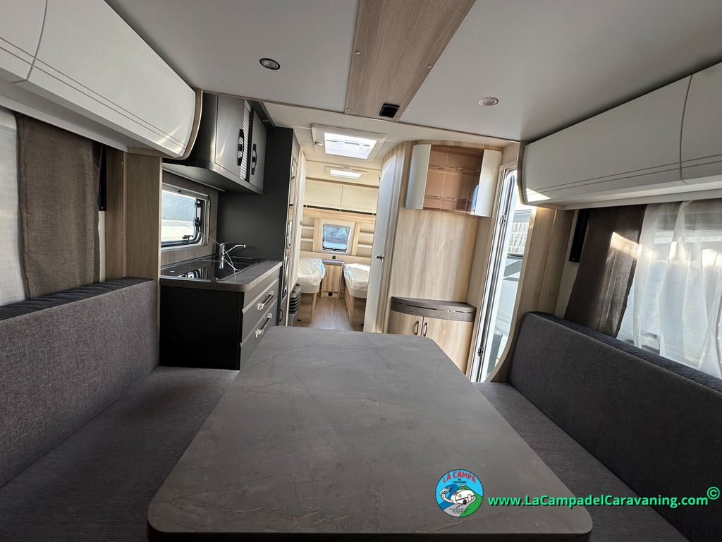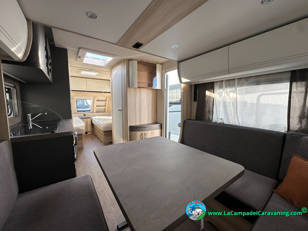 Calefacción por conductos, nevera 150L diseño especial Hobby trivalente con congelador, agua caliente, mosquitera en puerta de entrada, 3 claraboyas (1 panorámica), WC químico, ducha independiente con mampara, luces de leeds, luces regulables desde cuadro luces automático, estabilizador..