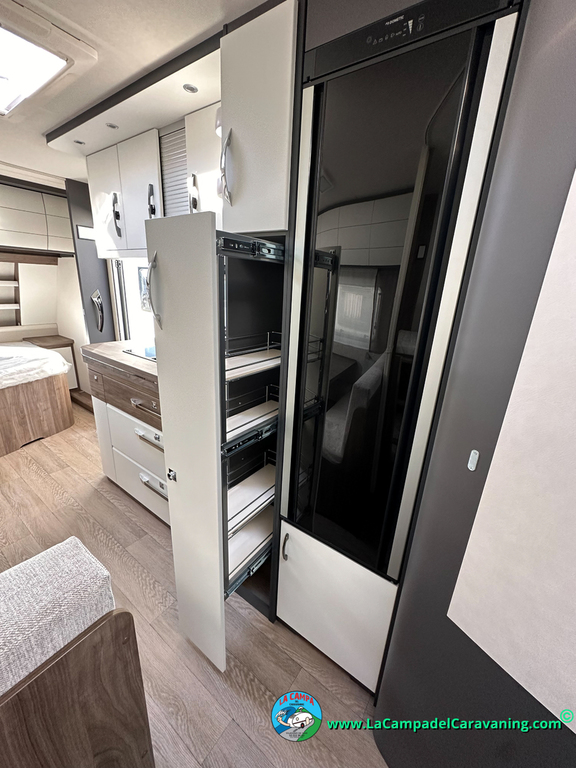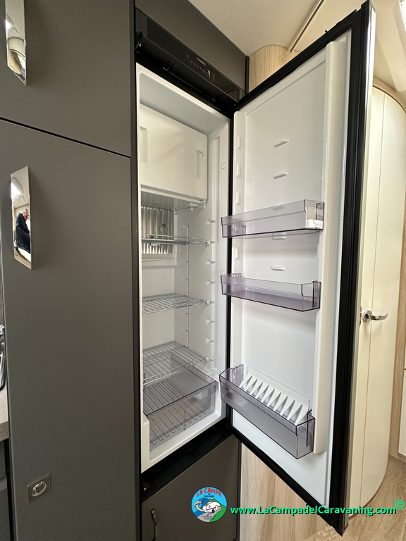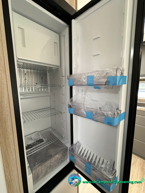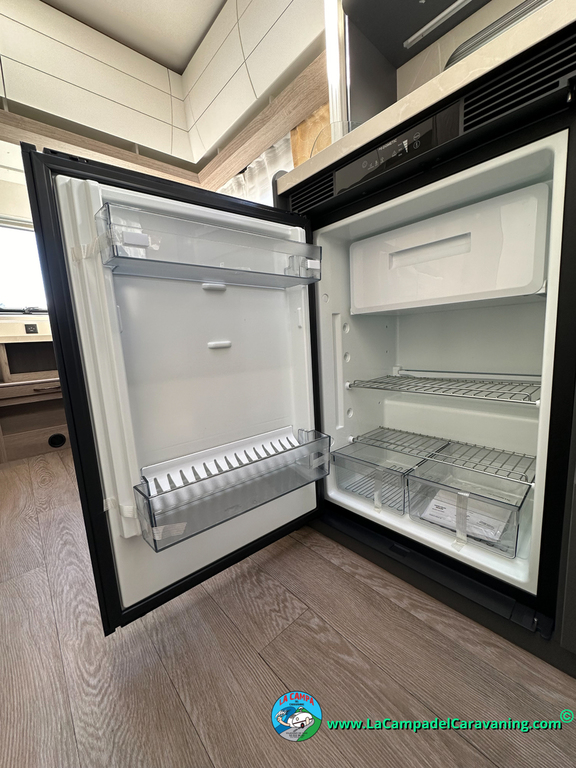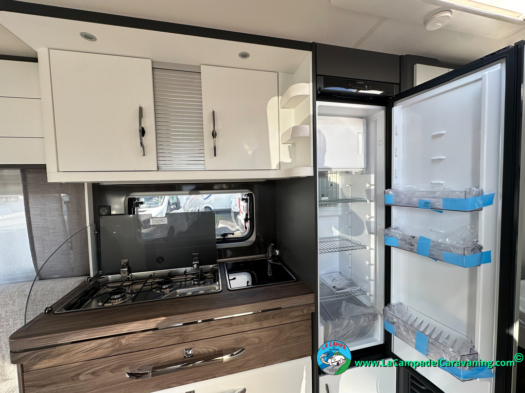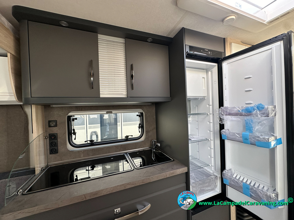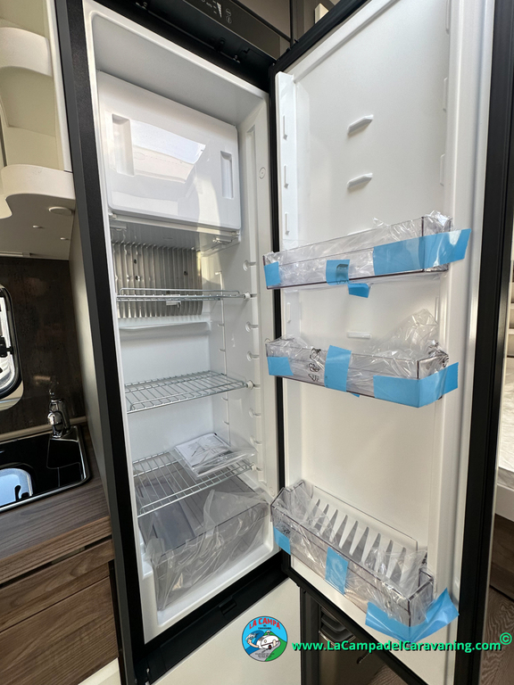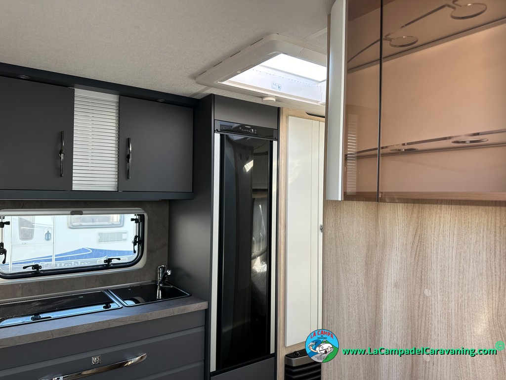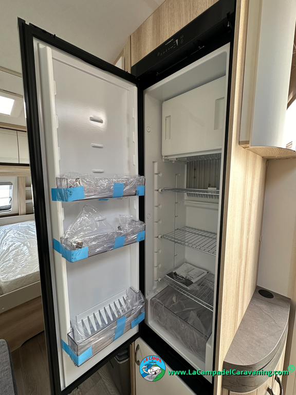 Nevera 150L diseño especial Hobby trivalente con congelador, Calefacción por conductos, agua caliente, mosquitera en puerta de entrada, 3 claraboyas (1 panorámica), estabilizador, WC químico, ducha independiente con mampara, luces de leeds, luzes regulables desde cuadro luces automático..