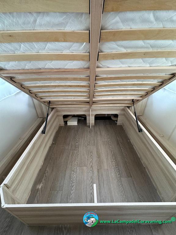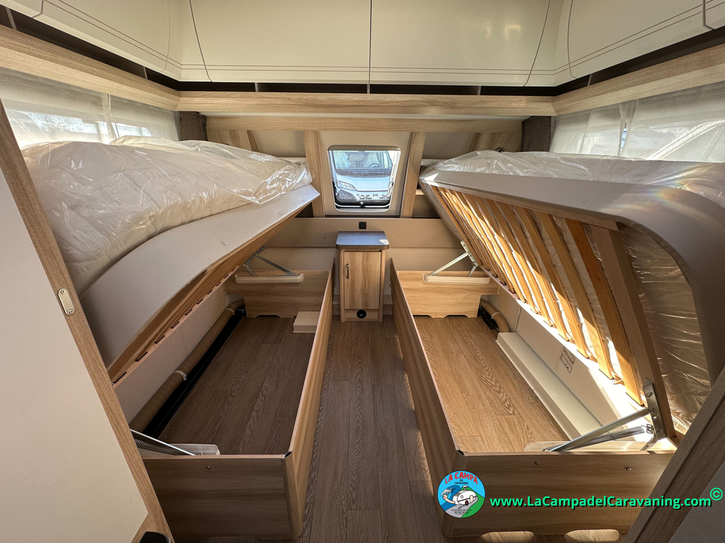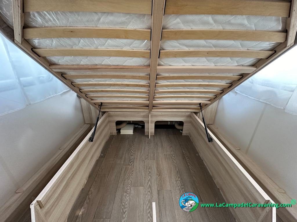 2 Camas gemelas con colchón en forma de canapé y una de ellas con acceso al arcón desde el exterior