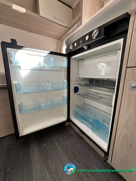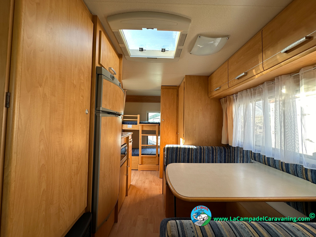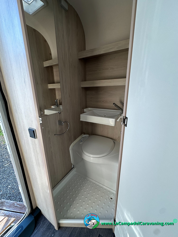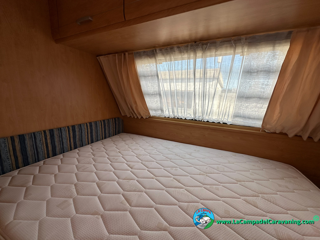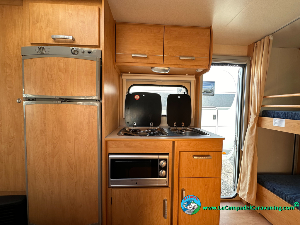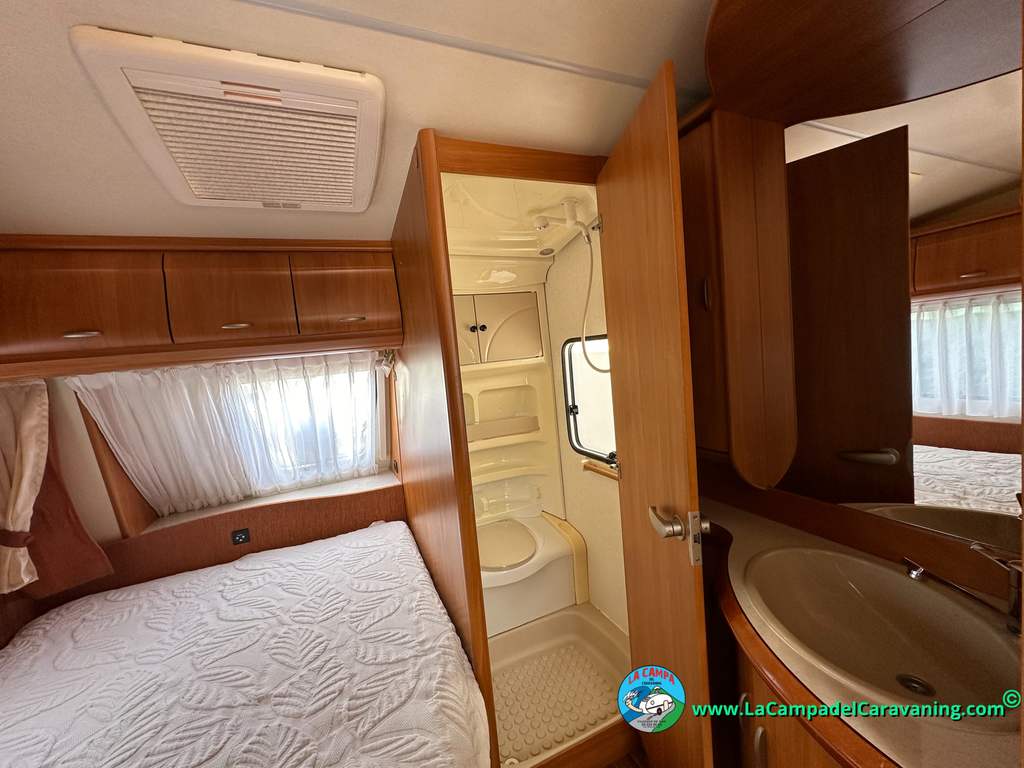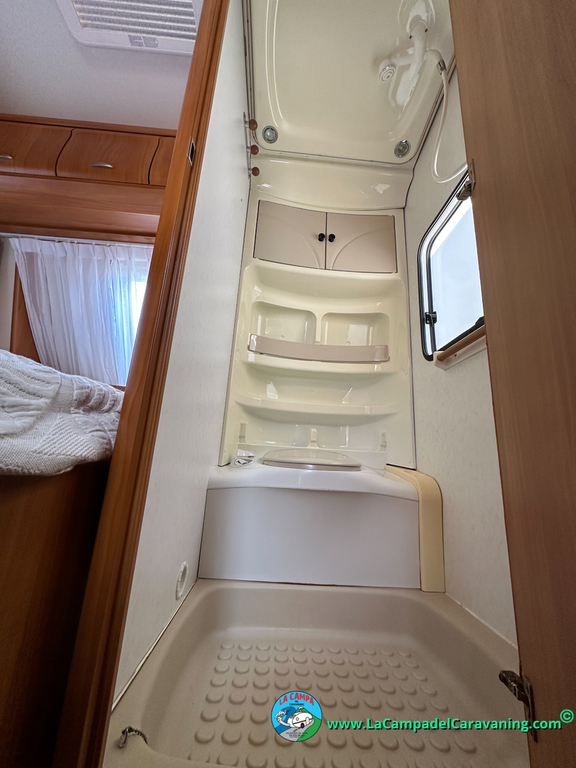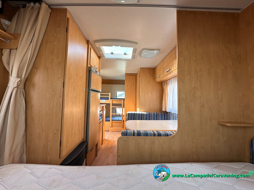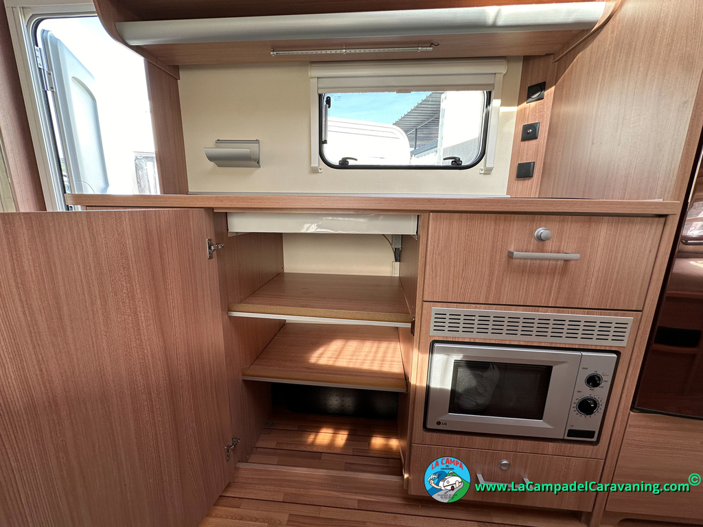 Nevera trivalente con congelador, WC químico, ducha semindependiente, antena TV, microondas, calefaccion con distribución por conductos, 2 claraboyas (1 panorámica), mosquitera en puerta de entrada, estabilizador Alko.